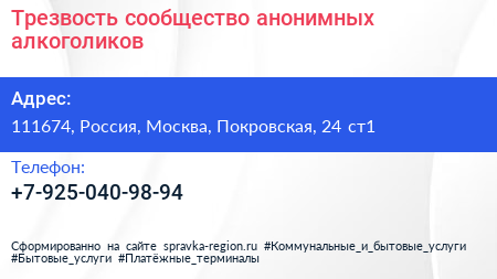 Трезвость, сообщество анонимных алкоголиков по адресу 111674, Россия, Москва, Покровская, 24 ст1 в дальнейшем Организация, размещена в следующих категориях: