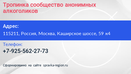 Тропинка, сообщество анонимных алкоголиков по адресу 115211, Россия, Москва, Каширское шоссе, 59 к4 в дальнейшем Организация, размещена в следующих категориях: