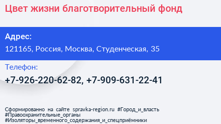Цвет жизни, благотворительный фонд по адресу 121165, Россия, Москва, Студенческая, 35 в дальнейшем Организация, размещена в следующих категориях: