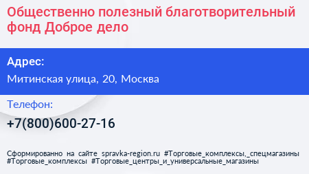 Общественно полезный благотворительный фонд «Доброе дело» по адресу Митинская улица, 20, Москва в дальнейшем Организация, размещена в следующих категориях: