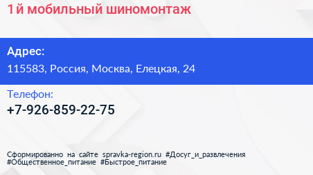 1-й мобильный шиномонтаж по адресу 115583, Россия, Москва, Елецкая, 24 в дальнейшем Организация, размещена в следующих категориях: