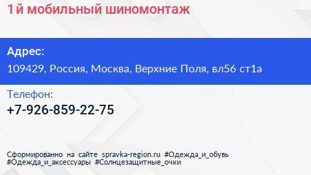 1-й мобильный шиномонтаж по адресу 109429, Россия, Москва, Верхние Поля, вл56 ст1а в дальнейшем Организация, размещена в следующих категориях: