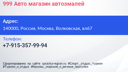 999-Авто, магазин автоэмалей по адресу 140000, Россия, Москва, Волковская, вл67 в дальнейшем Организация, размещена в следующих категориях: