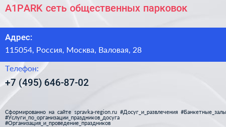 A1PARK, сеть общественных парковок по адресу 115054, Россия, Москва, Валовая, 28 в дальнейшем Организация, размещена в следующих категориях: