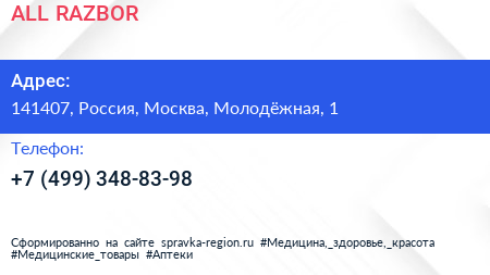 ALL-RAZBOR по адресу 141407, Россия, Москва, Молодёжная, 1 в дальнейшем Организация, размещена в следующих категориях:
