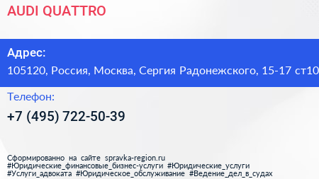 AUDI-QUATTRO по адресу 105120, Россия, Москва, Сергия Радонежского, 15-17 ст10 в дальнейшем Организация, размещена в следующих категориях: