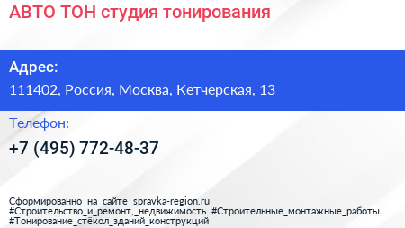 АВТО ТОН, студия тонирования по адресу 111402, Россия, Москва, Кетчерская, 13 в дальнейшем Организация, размещена в следующих категориях: