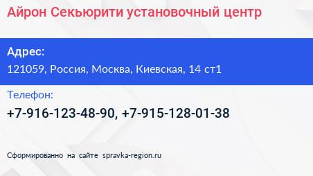 Айрон Секьюрити, установочный центр по адресу 121059, Россия, Москва, Киевская, 14 ст1 в дальнейшем Организация, размещена в следующих категориях: