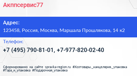 Акппсервис77 по адресу 123458, Россия, Москва, Маршала Прошлякова, 14 к2 в дальнейшем Организация, размещена в следующих категориях: