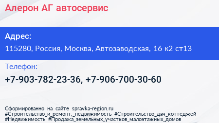 Алерон АГ, автосервис по адресу 115280, Россия, Москва, Автозаводская, 16 к2 ст13 в дальнейшем Организация, размещена в следующих категориях: