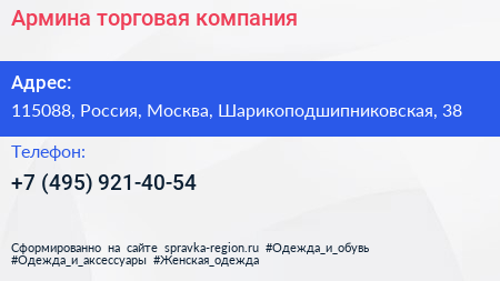Армина, торговая компания по адресу 115088, Россия, Москва, Шарикоподшипниковская, 38 в дальнейшем Организация, размещена в следующих категориях: