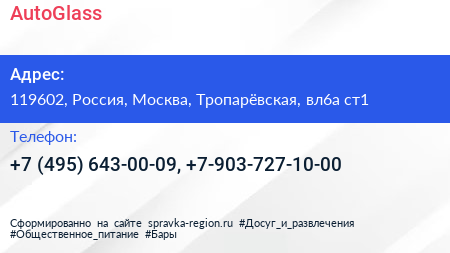 AutoGlass по адресу 119602, Россия, Москва, Тропарёвская, вл6а ст1 в дальнейшем Организация, размещена в следующих категориях: