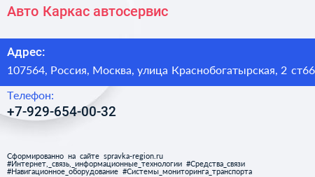 Авто-Каркас, автосервис по адресу 107564, Россия, Москва, улица Краснобогатырская, 2 ст66 в дальнейшем Организация, размещена в следующих категориях: