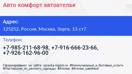 Авто-комфорт, автоателье по адресу 125252, Россия, Москва, Зорге, 13 ст7 в дальнейшем Организация, размещена в следующих категориях:
