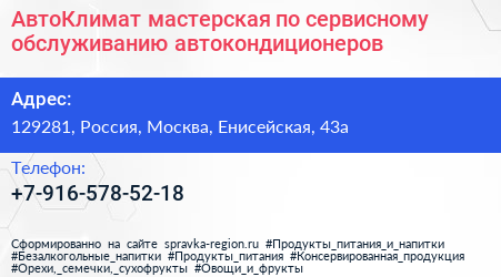 АвтоКлимат, мастерская по сервисному обслуживанию автокондиционеров по адресу 129281, Россия, Москва, Енисейская, 43а в дальнейшем Организация, размещена в следующих категориях: