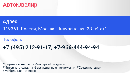 Для связи с организацией воспользуйтесь номером телефона: +7 (495) 212-91-17, +7-966-444-94-94.
