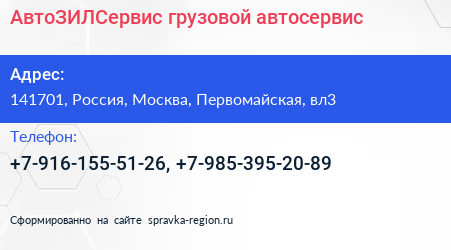 АвтоЗИЛСервис, грузовой автосервис по адресу 141701, Россия, Москва, Первомайская, вл3 в дальнейшем Организация, размещена в следующих категориях: