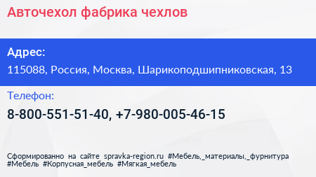 Авточехол, фабрика чехлов по адресу 115088, Россия, Москва, Шарикоподшипниковская, 13 в дальнейшем Организация, размещена в следующих категориях:
