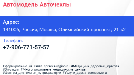 Автомодель-Авточехлы по адресу 141006, Россия, Москва, Олимпийский проспект, 21 к2 в дальнейшем Организация, размещена в следующих категориях: