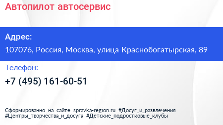 Автопилот, автосервис по адресу 107076, Россия, Москва, улица Краснобогатырская, 89 в дальнейшем Организация, размещена в следующих категориях: