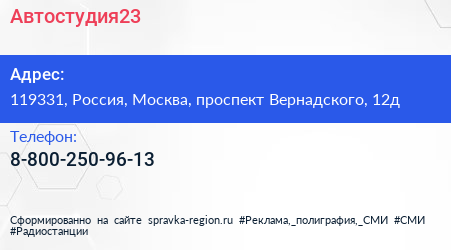Автостудия23 по адресу 119331, Россия, Москва, проспект Вернадского, 12д в дальнейшем Организация, размещена в следующих категориях: