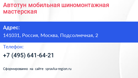 Автотун, мобильная шиномонтажная мастерская по адресу 141031, Россия, Москва, Подсолнечная, 2 в дальнейшем Организация, размещена в следующих категориях: