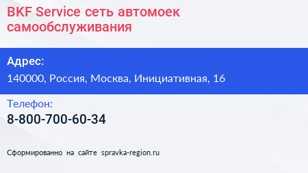 BKF Service, сеть автомоек самообслуживания по адресу 140000, Россия, Москва, Инициативная, 16 в дальнейшем Организация, размещена в следующих категориях: