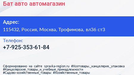 Бат-авто, автомагазин по адресу 115432, Россия, Москва, Трофимова, вл36 ст3 в дальнейшем Организация, размещена в следующих категориях: