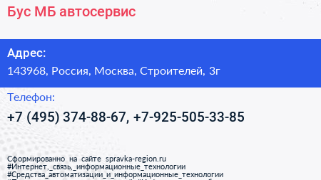 Бус-МБ, автосервис по адресу 143968, Россия, Москва, Строителей, 3г в дальнейшем Организация, размещена в следующих категориях: