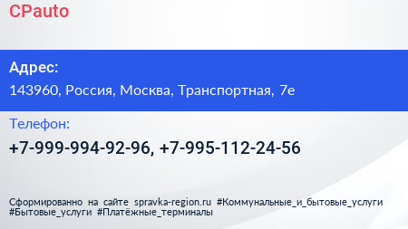 CPauto по адресу 143960, Россия, Москва, Транспортная, 7е в дальнейшем Организация, размещена в следующих категориях: