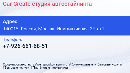 Car Create, студия автостайлинга по адресу 140015, Россия, Москва, Инициативная, 3Б ст1 в дальнейшем Организация, размещена в следующих категориях: