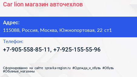 Car-lion, магазин авточехлов по адресу 115088, Россия, Москва, Южнопортовая, 22 ст1 в дальнейшем Организация, размещена в следующих категориях: