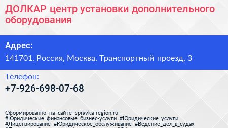 ДОЛКАР, центр установки дополнительного оборудования по адресу 141701, Россия, Москва, Транспортный проезд, 3 в дальнейшем Организация, размещена в следующих категориях: