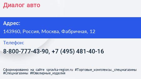 Диалог-авто по адресу 143960, Россия, Москва, Фабричная, 12 в дальнейшем Организация, размещена в следующих категориях: