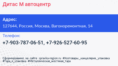 Дитас-М, автоцентр по адресу 127644, Россия, Москва, Вагоноремонтная, 14 в дальнейшем Организация, размещена в следующих категориях: