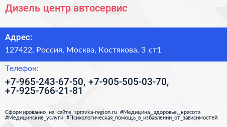 Дизель-центр, автосервис по адресу 127422, Россия, Москва, Костякова, 3 ст1 в дальнейшем Организация, размещена в следующих категориях: