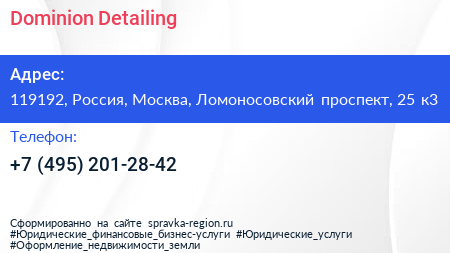 Dominion Detailing по адресу 119192, Россия, Москва, Ломоносовский проспект, 25 к3 в дальнейшем Организация, размещена в следующих категориях: