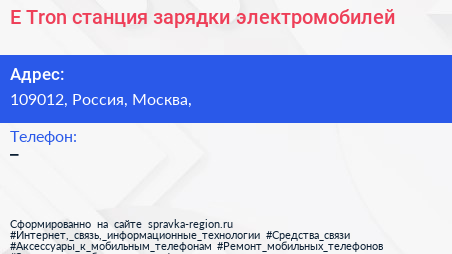 E-Tron, станция зарядки электромобилей по адресу 109012, Россия, Москва, в дальнейшем Организация, размещена в следующих категориях: