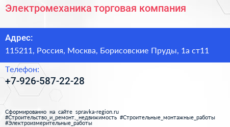 Электромеханика, торговая компания по адресу 115211, Россия, Москва, Борисовские Пруды, 1а ст11 в дальнейшем Организация, размещена в следующих категориях: