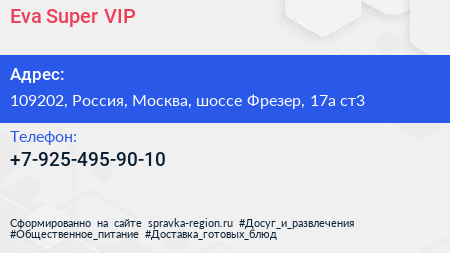 Eva Super VIP по адресу 109202, Россия, Москва, шоссе Фрезер, 17а ст3 в дальнейшем Организация, размещена в следующих категориях: