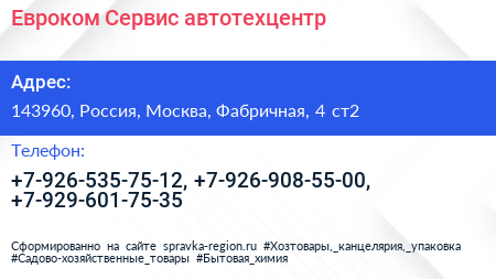 Евроком-Сервис, автотехцентр по адресу 143960, Россия, Москва, Фабричная, 4 ст2 в дальнейшем Организация, размещена в следующих категориях: