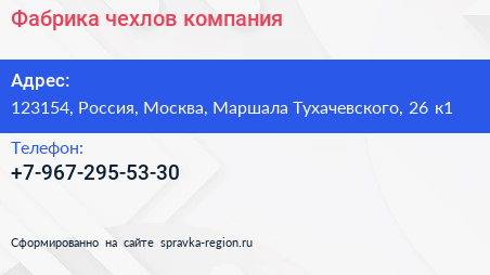 Фабрика чехлов, компания по адресу 123154, Россия, Москва, Маршала Тухачевского, 26 к1 в дальнейшем Организация, размещена в следующих категориях:
