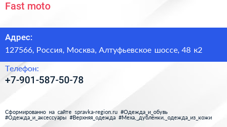 Fast-moto по адресу 127566, Россия, Москва, Алтуфьевское шоссе, 48 к2 в дальнейшем Организация, размещена в следующих категориях:
