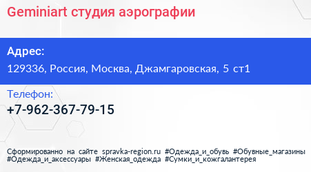 Geminiart, студия аэрографии по адресу 129336, Россия, Москва, Джамгаровская, 5 ст1 в дальнейшем Организация, размещена в следующих категориях: