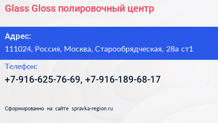 Glass Gloss, полировочный центр по адресу 111024, Россия, Москва, Старообрядческая, 28а ст1 в дальнейшем Организация, размещена в следующих категориях: