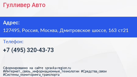 Гулливер Авто по адресу 127495, Россия, Москва, Дмитровское шоссе, 163 ст21 в дальнейшем Организация, размещена в следующих категориях: