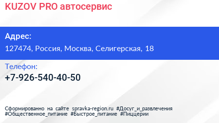 KUZOV-PRO, автосервис по адресу 127474, Россия, Москва, Селигерская, 18 в дальнейшем Организация, размещена в следующих категориях: