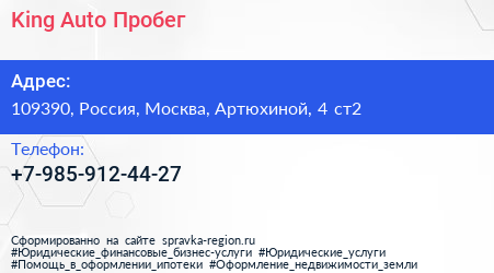 King-Auto-Пробег по адресу 109390, Россия, Москва, Артюхиной, 4 ст2 в дальнейшем Организация, размещена в следующих категориях: