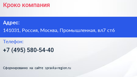 Кроко, компания по адресу 141031, Россия, Москва, Промышленная, вл7 ст6 в дальнейшем Организация, размещена в следующих категориях: