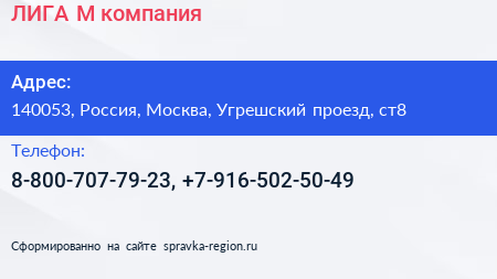 ЛИГА-М, компания по адресу 140053, Россия, Москва, Угрешский проезд, ст8 в дальнейшем Организация, размещена в следующих категориях: